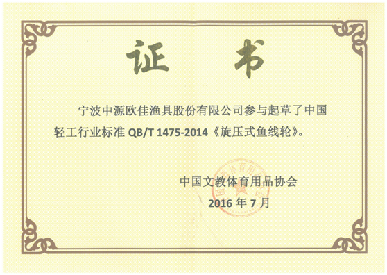 寧波中源歐佳漁具股份有限公司作為中國(guó)文教體育用品協(xié)會(huì)的會(huì)長(zhǎng)單位,積極參與起草了中國(guó)輕工業(yè)標(biāo)準(zhǔn)QB/T 4728-2014《封閉式魚(yú)線輪》和中國(guó)輕工業(yè)標(biāo)準(zhǔn)QB/T 1475-2014《旋壓式魚(yú)線輪》,并受到了協(xié)會(huì)的表彰。